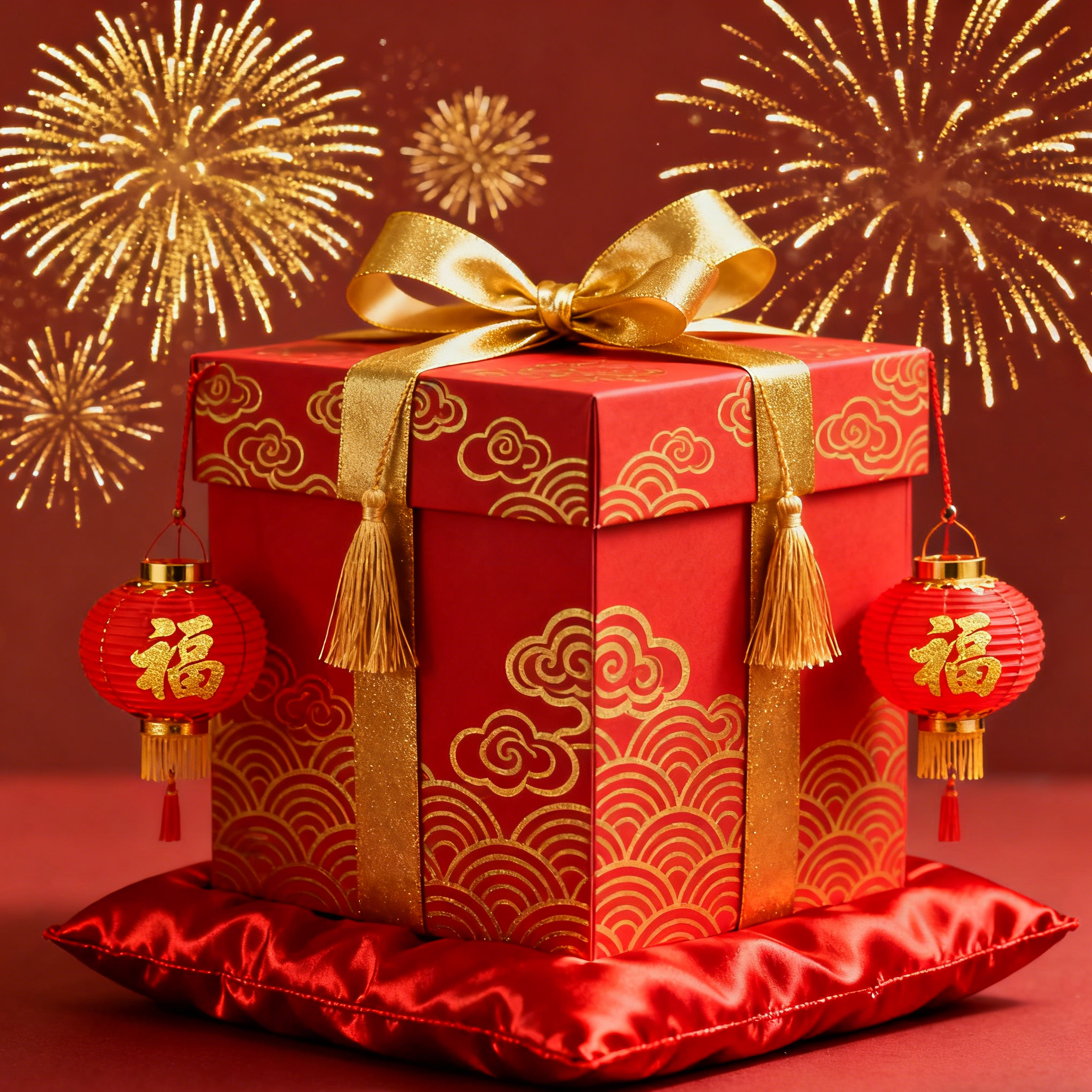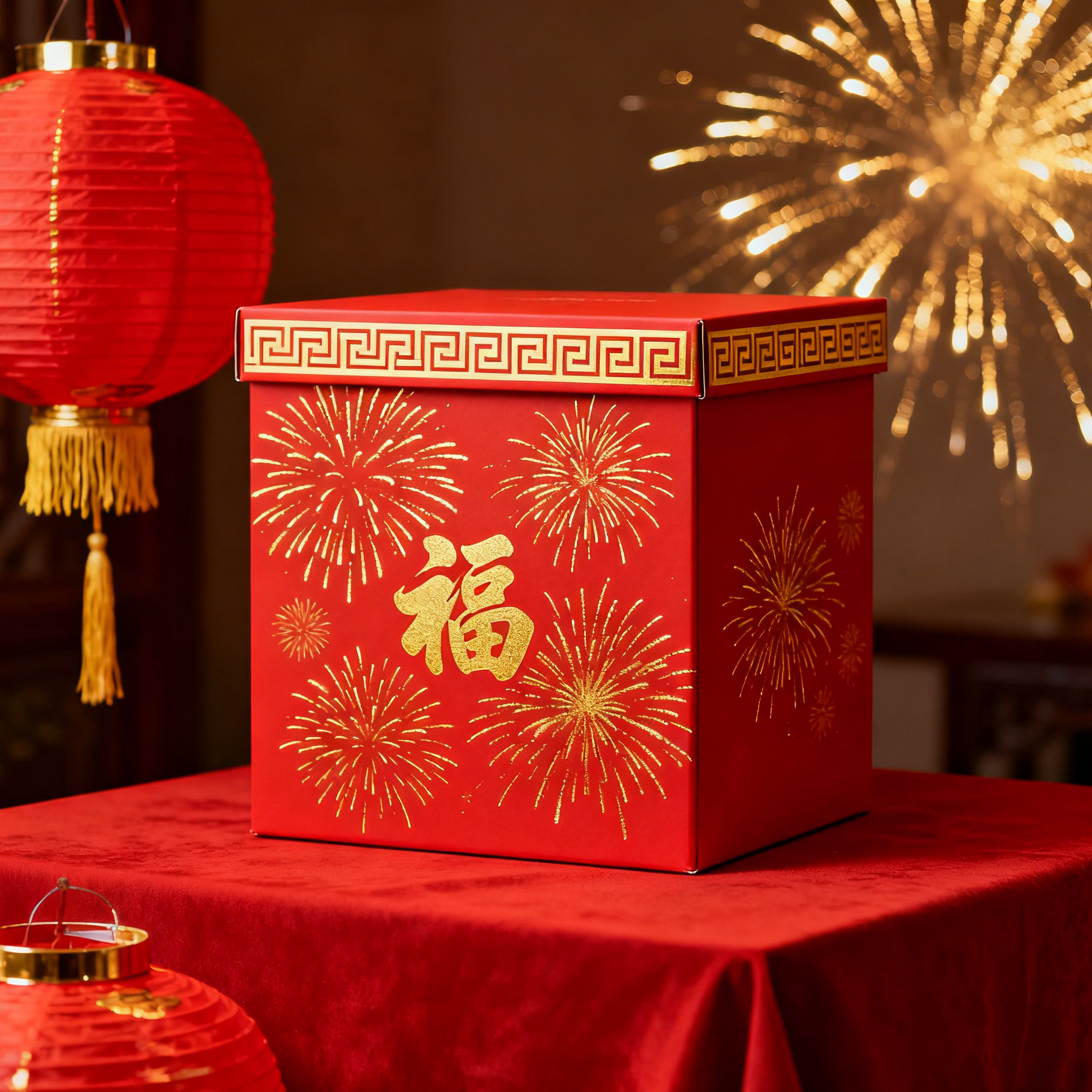 整体设计都紧扣 “春节喜庆 、福气满盈” 的主题,通过传统元素传递热闹、吉祥的新年氛围,承载着浓郁的中式年味,适配春节期间的各类礼赠场景。烟花是春节辞旧迎新、热闹欢庆的象征,寓意新岁顺遂、生活绚烂,灯笼是春节标志性装饰,代表团圆喜庆,“福” 字直接传递福气临门、幸福安康的核心祝福,是春节礼赠中最直接的吉祥符号。