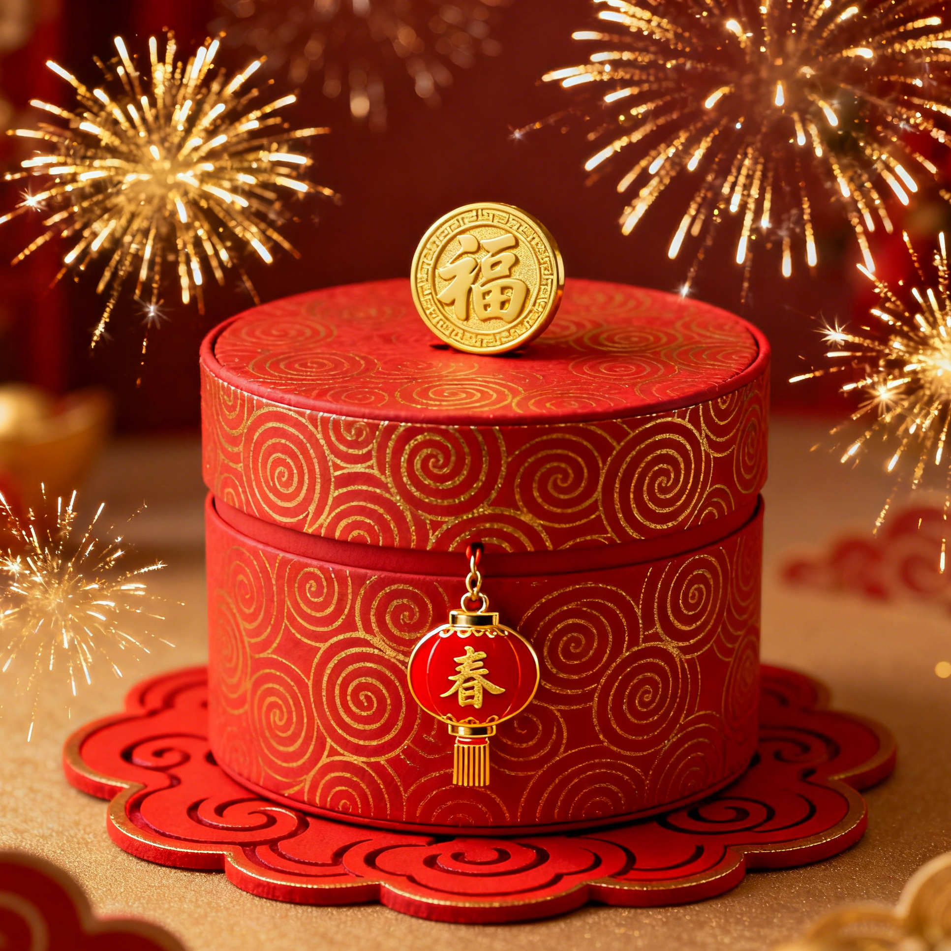 灯笼是春节的标志性装饰代表团圆庆热闹迎新;“春” 字直接点明新春佳节的主题,传递春回大地、万象更新的新年期许;红色象征红火兴旺、喜庆热烈,金色凸显尊贵吉祥;圆形礼盒则暗含团圆美满的寓意,适配春节阖家团聚的场景