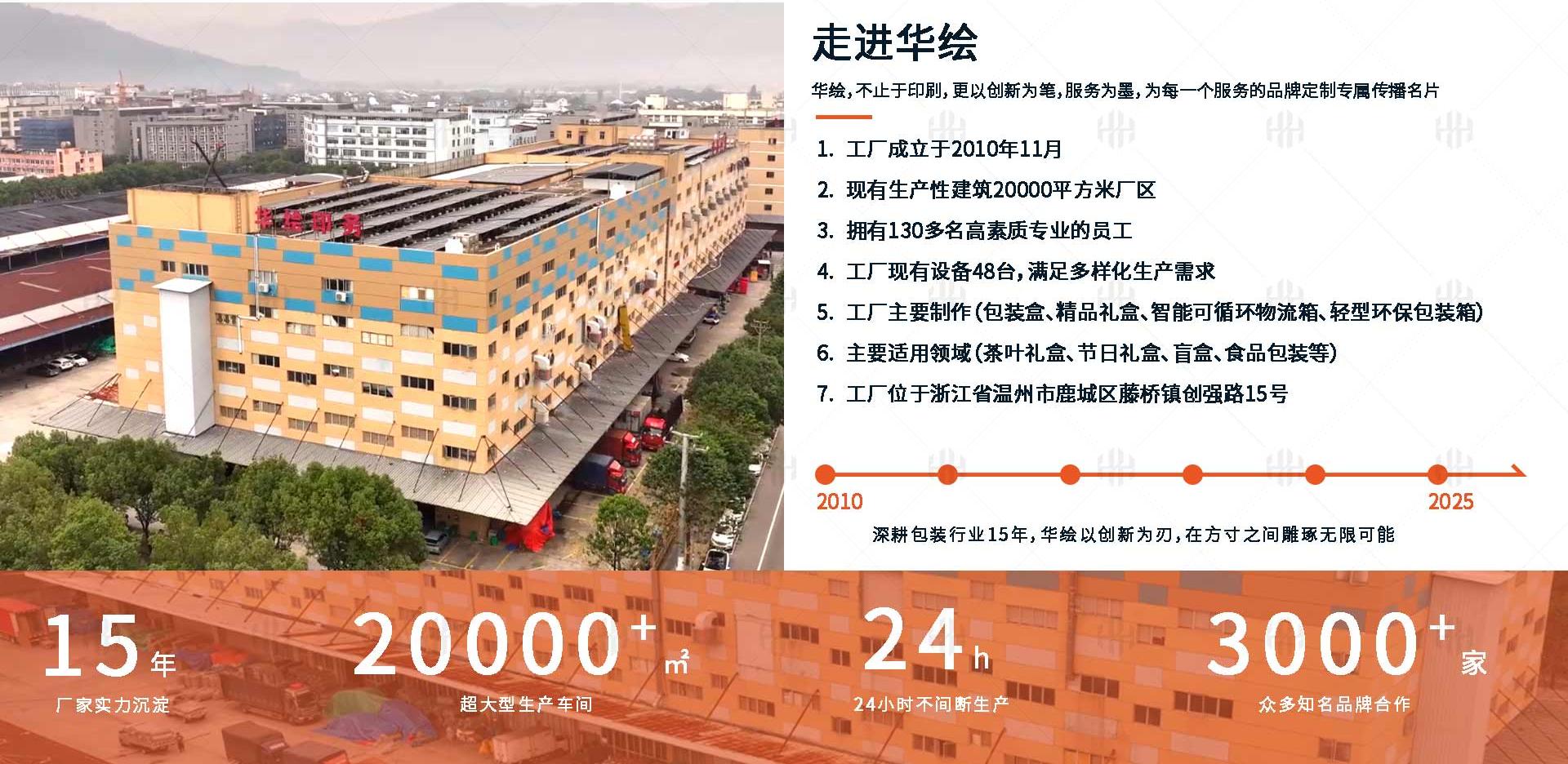 温州市华绘印务有限公司是一家集设计、生产、销售为一体的综合性生产企业。工厂成立于201011月,现有生产性建筑20000平方米厂区,专业生产研发轻型环保包装箱、精品礼盒、智能可循环物流箱、礼盒、盲盒、食品包装盒等产品,我们的产品涵盖多个领域。公司拥有海德堡五色印刷机、全自动覆膜机、全自动模切机、全自动糊盒机等多条高度自动化的流水线10余台,配套设备53余台,设计、印刷、模切、糊盒等多工艺一条龙先进生产线,拥有完整、科学的质量管理体系。以匠心专业的服务,让华绘品牌成为全球用户的信赖精品礼盒!三年豹变,建成行业内开创性AI+一个起订”精品礼盒智造平台!欢迎各界朋友莅临参观、指导和业务洽谈。