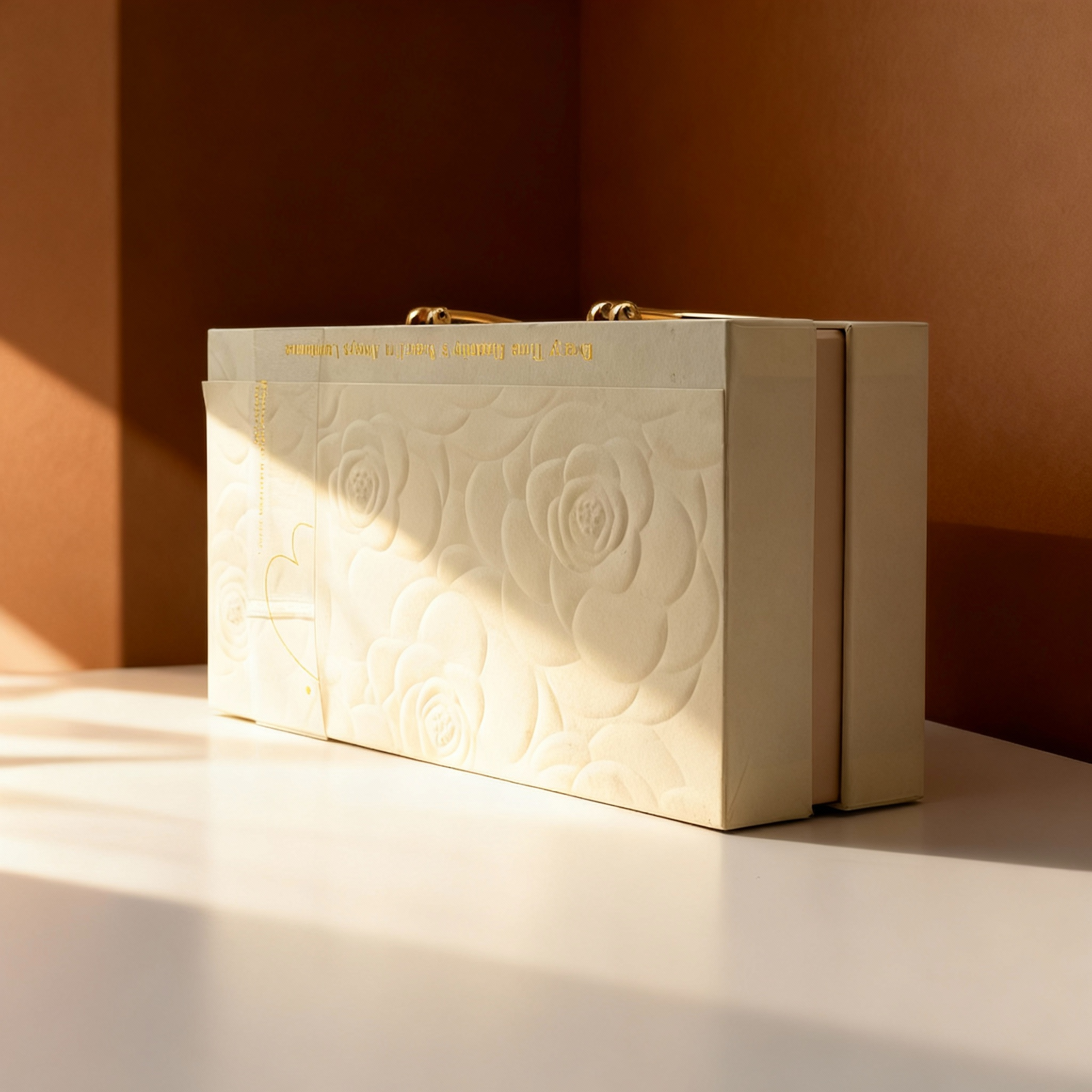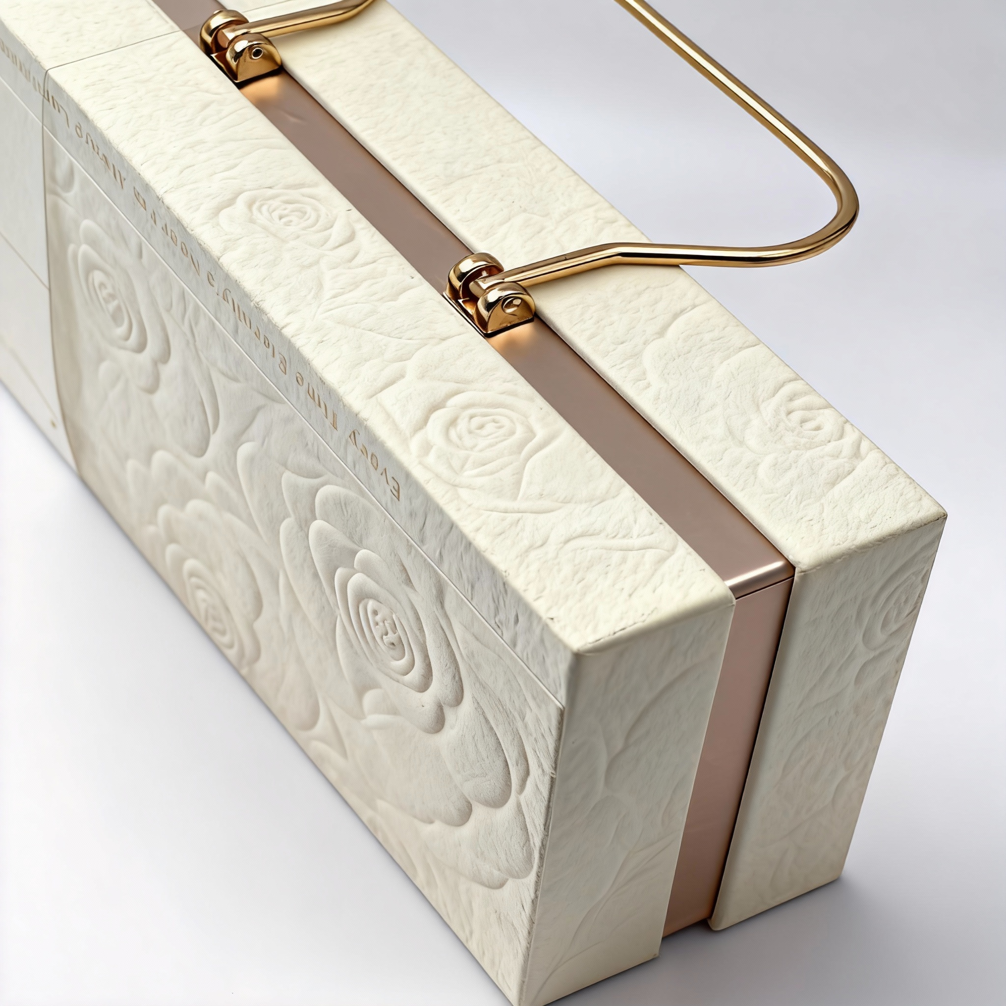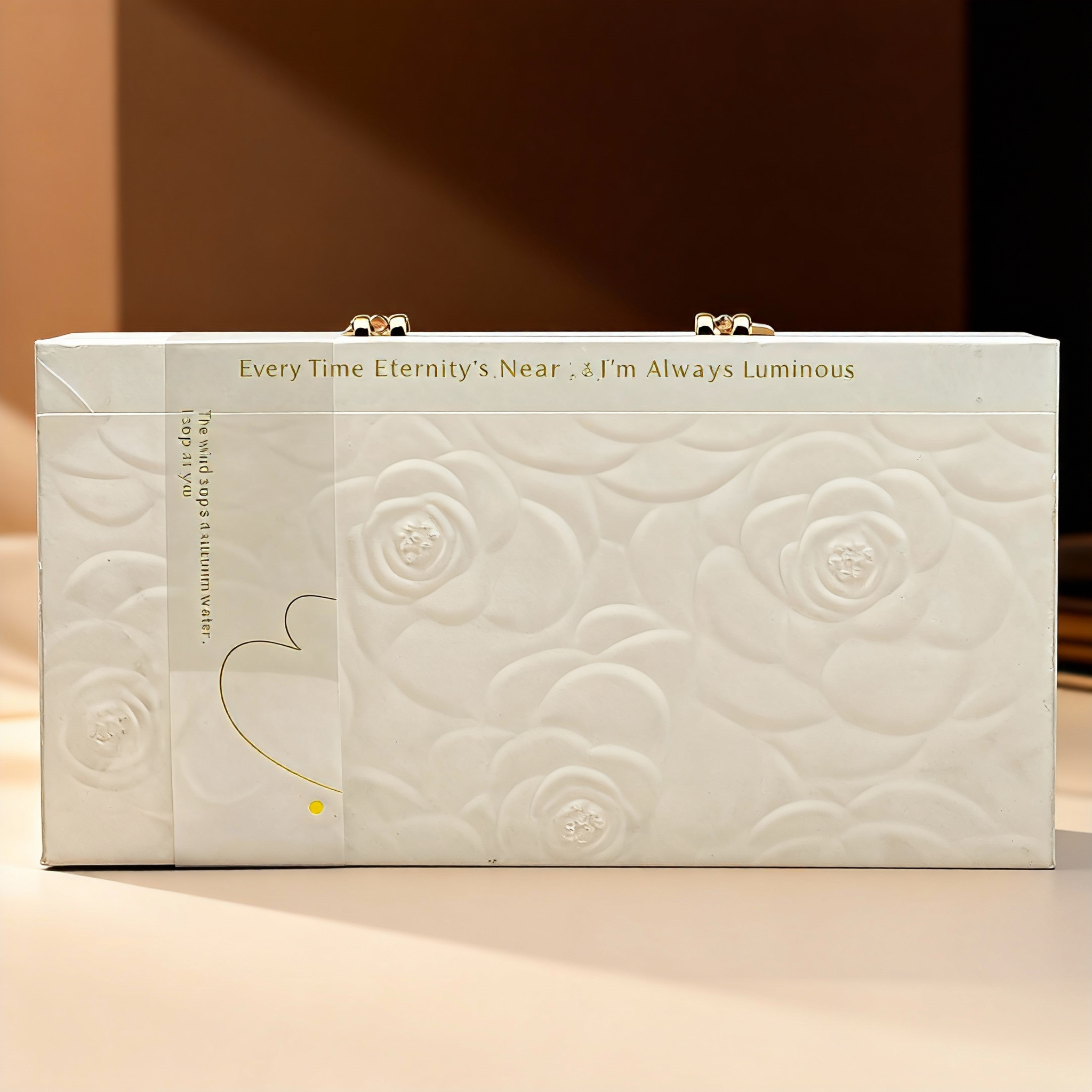 浅色系的花朵压纹有温柔、细腻、雅致的质感;浅白色主调显纯净、温柔,金色提手提升了精致感,整体风格既简约高级,含蓄而真挚的情感,适配偏文艺、细腻的礼赠需求;“Every Time, Eternity's Near; Always luminous”表达长久陪伴、时刻美好的情感。